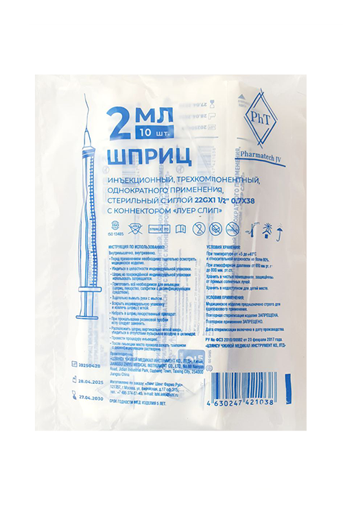 Шприц PharmatechJV 3-компон стерил инъекц одн прим с надет игл 23GХ1 1/4 0.6x30 мм 2 мл x10 пакет