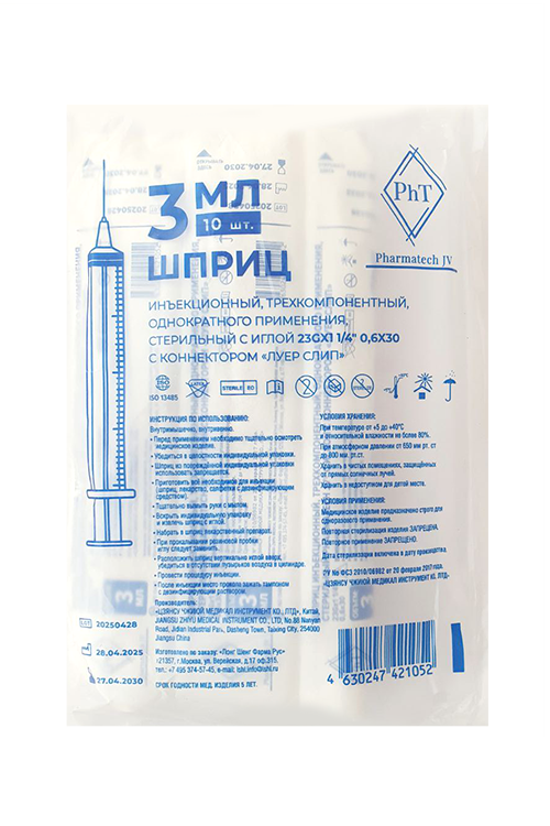 Шприц PharmatechJV 3-компон стерил инъекц одн прим с надет игл 23GХ1 1/4 0.6x30 мм 3 мл x10 пакет