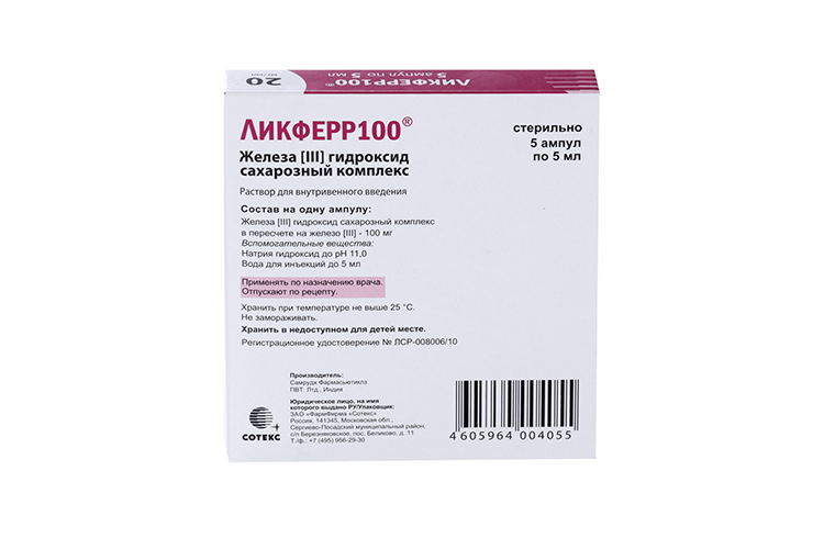 | ЛИКФЕРР 100® | р-р д/в/в введения 20 мг/1 мл: амп. 5 мл 3, 5, 6 или 24 шт., , фл. 5 мл 1, 3 или 5 шт. рег. №: ЛСР-008006/10 от 12.08.10 - Бессрочно |