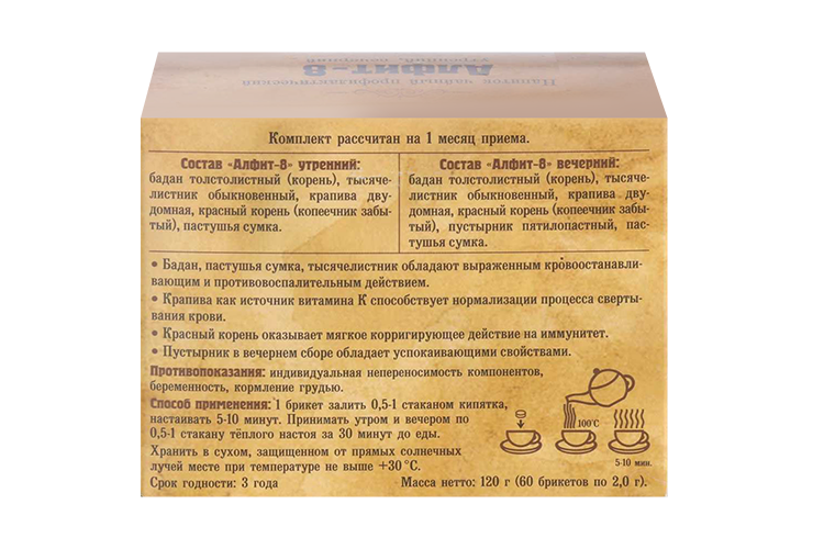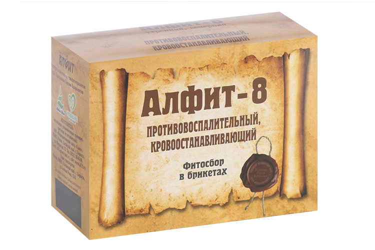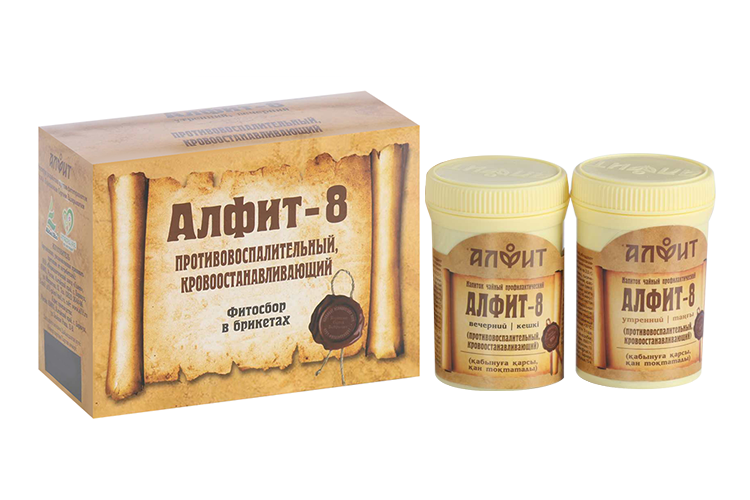 «Алфит-8» утренний: ,1 брикет залить 0,5–1 стаканом кипятка. Настаивать 5–10 мин. «Водяной бани» не требуется. Принимать утром по 0,5–1 стакану теплого настоя за 30 мин. до еды.
