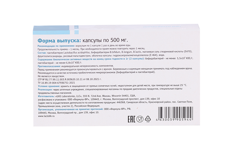 Состав: лактобактерии Lactobacillus acidophilus, бифидобактерии B.bifidum, B.longum, B.lactis, магниевая соль стеариновой кислоты (Е470), фруктоолигосахариды, рисовый мальтодекстрин, оболочка капсулы: гидроксипропилметилцеллюлоза (Е 464), вода.