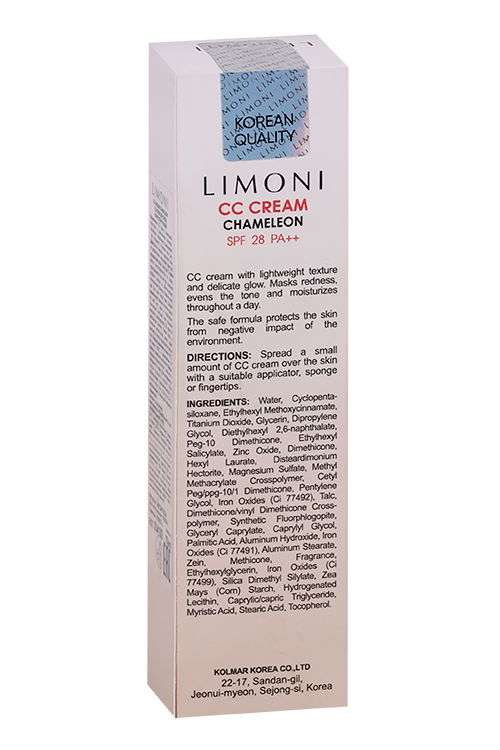 CC-крем LIMONI Chameleon — это универсальное средство для создания безупречного и естественного макияжа, которое отлично подходит для ежедневного ухода и коррекции кожи. Благодаря особой формуле, этот крем способен адаптироваться под любой тон кожи, делая ее более ровной, сияющей и здоровой. Легкая текстура CC-крема обеспечивает быстрое распределение по поверхности лица, создавая эффект второй кожи без ощущения тяжести. Он эффективно скрывает несовершенства — покраснения, мелкие морщинки, неровности и пигментные пятна, при этом не утяжеляя кожу и не забивая поры.