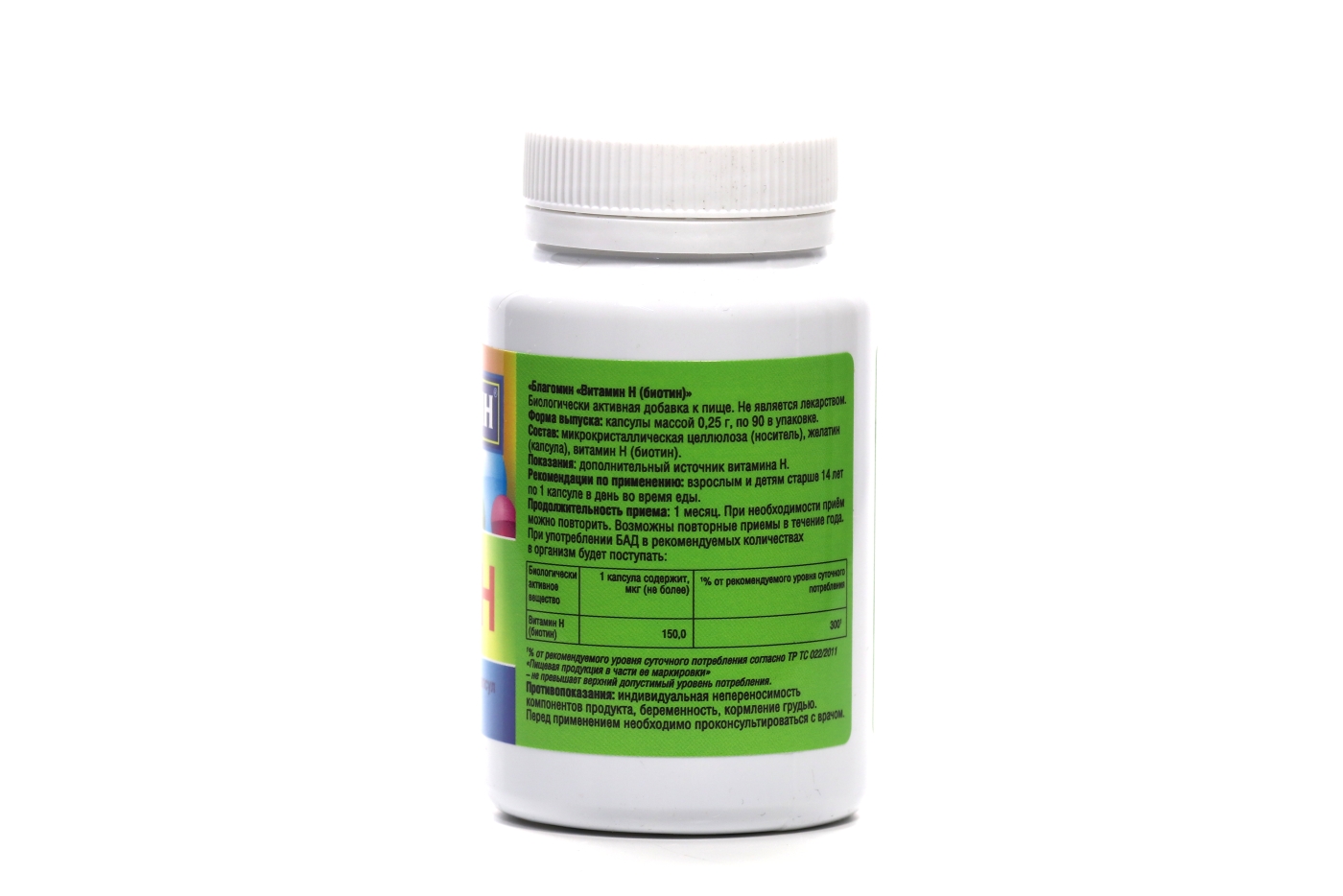 Благомин Биотин - дополнительный источник витамина Н. 1 капсула содержит 150 мкг биотина, что составляет 300 % от рекомендованного уровня суточного потребления и не превышает верхний допустимый уровень потребления.