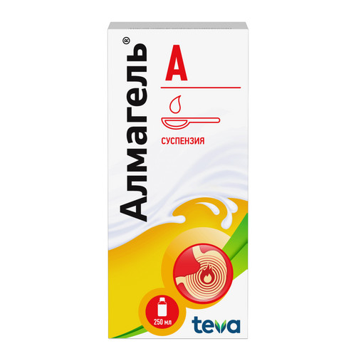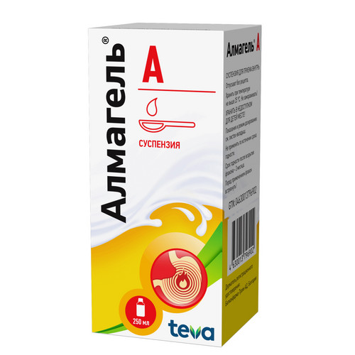 Регистрационный номер: ЛП-№(003346)-(РГ-RU). Наименование лекарственного препарата: Алмагель А, суспензия для приема внутрь. Группировочное наименование: Алгелдрат+Бензокаин+Магния гидроксид. Действующие вещества: алюминия гидроксида гель + бензокаин + магния гидроксида паста. 5 мл (1 мерная ложка) суспензии содержат: алюминия гидроксида гель 2,18 г (в пересчете на алюминия оксид 218 мг), магния гидроксида паста 350 мг (в пересчете на магния оксид 75 мг),бензокаин 109 мг. Лекарственная форма: суспензия для приема внутрь. Фармакотерапевтическая группа: средства для лечения кислотозависимых заболеваний, антациды, антациды, другие комбинации. Код ATX: А02АХ. Показания к применению: препарат показан к применению у взрослых и детей в возрасте старше 15 лет. Острый гастрит, хронический гастрит с повышенной и нормальной секреторной функцией желудка (в фазе обострения), острый дуоденит, энтерит, колит, язвенная болезнь желудка и двенадцатиперстной кишки (в фазе обострения), грыжа пищеводного отверстия диафрагмы, гастроэзофагеальный рефлюкс, рефлюкс-эзофагит, дуоденогастральный рефлюкс, симптоматические язвы ЖКТ различного генеза, эрозии слизистой оболочки верхних отделов желудочно-кишечного тракта, острый панкреатит, обострение хронического панкреатита, изжога и боли в эпигастрии после погрешностей в питании, избыточного употребления этанола, никотина, кофе, приема лекарственных средств, раздражающих слизистую оболочку желудка. Способ применения (полную информацию см. в общей характеристике лекарственного препарата): для приема внутрь. Препарат принимают за 10–15 минут до еды или через 45–60 минут после приема пищи и вечером перед сном.Перед применением суспензию необходимо тщательно гомогенизировать, встряхивая флакон или разминая и встряхивая пакетик. Противопоказания (полную информацию см. в общей характеристике лекарственного препарата): гиперчувствительность к действующим веществам и/или к любому из вспомогательных веществ, тяжелая форма почечной недостаточности, сильно ослабленные пациенты, тяжелая гипофосфатемия, беременность и период грудного вскармливания, врожденная непереносимость фруктозы, болезнь Альцгеймера, детский возраст до 15 лет, одновременное применение с сульфаниламидами. Нежелательные реакции (полную информацию см. в общей характеристике лекарственного препарата): диарея или запор, гипермагниемия, аллергические реакции, такие как бронхоспазм, зуд, крапивница, ангионевротический отек и анафилактические реакции быстрого типа, гипералюминиемия, гипофосфатемия, которая может привести к повышенной резорбции костной ткани, гиперкальциурии, остеомаляции, боль в животе. С осторожностью (полную информацию см. в общей характеристике лекарственного препарата): детский возраст, остеопороз, почечная недостаточность легкой или умеренной степени тяжести, заболевания печени, печеночная недостаточность, алкоголизм, пожилой возраст старше 65 лет, бронхиальная астма, эпилепсия, черепно-мозговая травма, заболевания головного мозга, тяжелая сердечная недостаточность, синдром раздраженного кишечника. Срок годности: 2 года. После вскрытия флакона – 3 месяца. Условия отпуска: отпускают без рецепта. Полная информация по препарату содержится в общей характеристике лекарственного препарата.