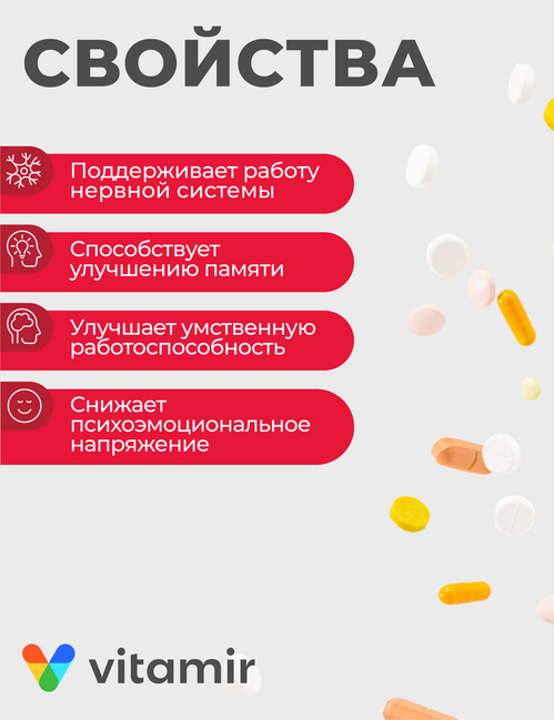 Витамины С, В1, В6, В12 — укрепляют нервную систему, снижают раздражительность, способствует улучшению памяти, защищают организм от стресса. Глицин в сочетании с данными витаминами помогает организму справляться с повышенными умственными и эмоциональными нагрузками.
