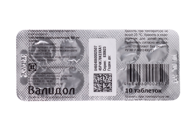 | Валидол | Таб. подъязычные 60 мг: 10 или 20 шт. рег. №: Р N001400/01 от 20.12.07 - Бессрочно Дата переоформления: 05.05.22 |
