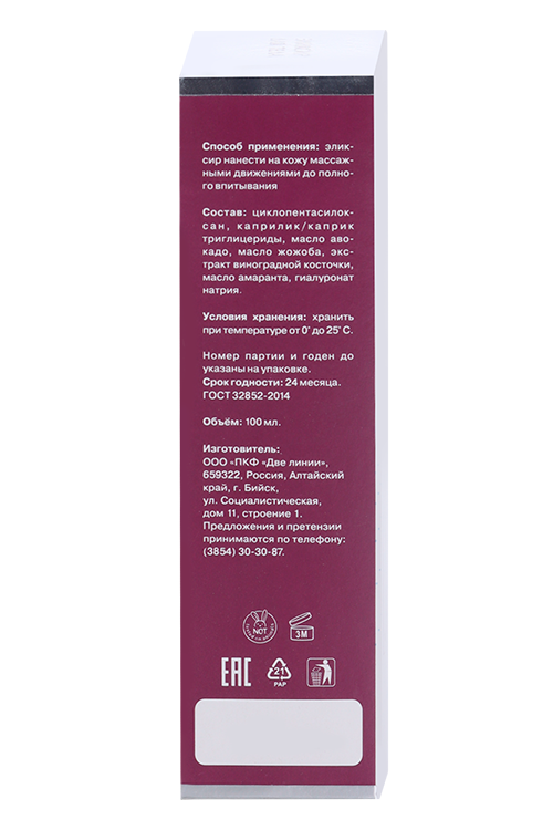 циклопентасилоксан, каприлик/каприк триглицериды, масло авокадо, масло жожоба, экстракт виноградной косточки, масло амаранта, гиалуронат натрия.