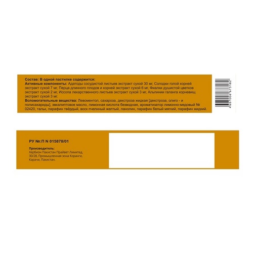 адатоды сосудистой экстракт 30 мг, альпинии галанги экстракт 3 мг, иссопа лекарственного экстракт 3 мг, перца длинного экстракт 6 мг, солодки голой корней экстракт 7 мг, фиалки пахучей экстракт 2 мг