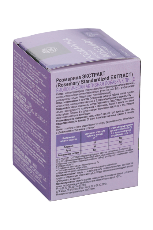 Экстракт Розмарина (сертифицирован и стандартизирован по розмариновой кислоте) - 250 мг (12,5 мг розмариновой кислоты, суточная норма не установлена).