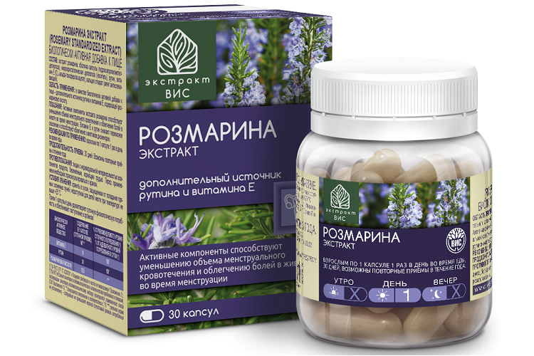 Активные компоненты экстракта розмарина способствуют уменьшению объема менструального кровотечения и облегчению болей в животе во время менструации. Витамин Е и рутин снижают перекисное окисление и способствуют облегчению симптомов дисменореи.