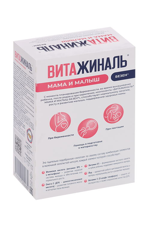 Витажиналь® Мама и Малыш Безен® - биологически активная добавка к пище для женщин, планирующих беременность, во время беременности, после родов и кормящих грудью. Известно, что во время подготовки и в течение самой беременности и лактации организму женщины требуется большее количество витаминов и микроэлементов, недостаток которых может привести к негативным изменениям в организме матери или плода. В такой ситуации рациональным представляется их дополнительный прием не только во время беременности, но и на этапе ее планирования, и в период лактации.