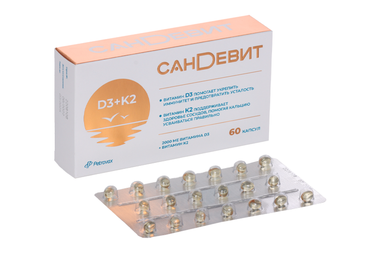 масло подсолнечника рафинированное, капсула желатиновая (содержит желатин, влагоудерживающий агент-глицерин (Е422)), витамин К2 (менахинон), витамин D3 (холекальциферол).