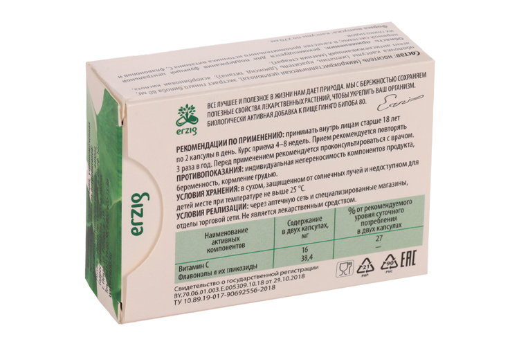 носитель (микрокристаллическая целлюлоза), экстракт гинкго билоба 80 мг, оболочка капсулы (желатин, краситель (диоксид титана)), L-аскорбиновая кислота (Витамин С), агент антислеживающий (магния стеарат).
