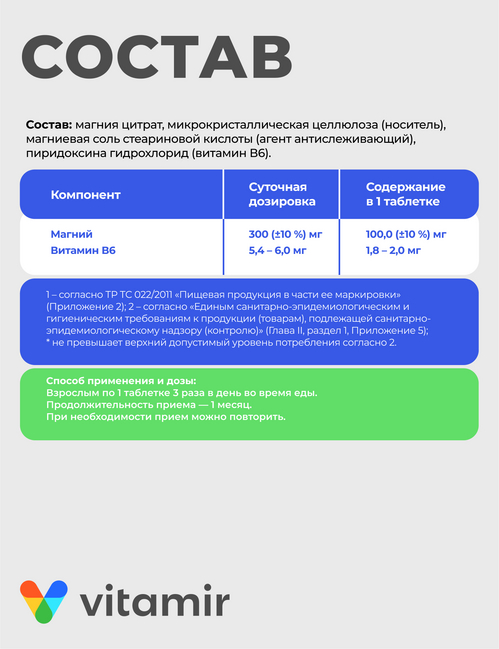 Состав: магния цитрат (Мд), микрокристаллическая целлюлоза (носитель), стеариновая кислота (стабилизатор), рибофлавин (витамин В2), пиридокоша гидрохлорид (витамин Вб), оболочка таблетки: гидроксипропилметилцеллюлоза (загуститель), полиэтиленгликоль (глазирователь), титана диоксид (краситель) содержание в таблетке: витамины: В2 - 1,8 - 2,0 мг, В6 - 1,8 - 2,0 мг, магний - 100мг±10%