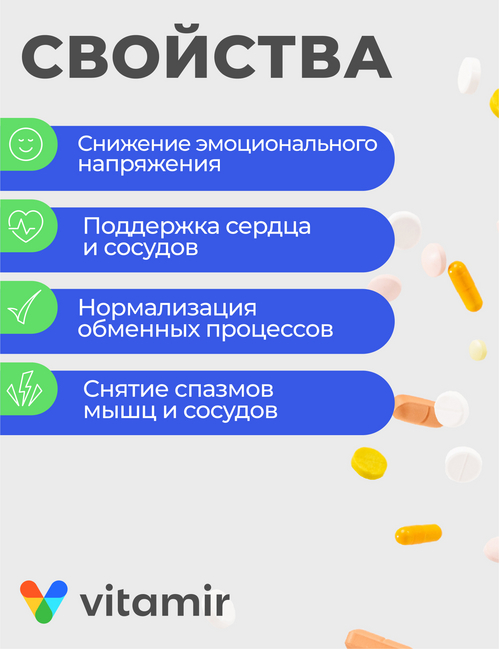 Описание товара: , «Магний В6 Форте Витамир®» Магний - макроэлемент, принимающий участие в более чем 300 ферментативных реакциях. Магний нужен для выработки белка, ДНК, для расщепления глюкозы, выведения из организма токсинов, для усвоения витамина С, тиамина (В1) и пиридоксина (В6). Магний способствует устойчивости структуры клетки в процессе роста, принимает участие в процессе регенерации клеток организма, благотворно влияет на работу внутренних органов, снижает раздражительность и защищает от радиации. Витамин В2 (рибофлавин) - обладает антиоксидантными свойствами, участвует в обменных процессах и положительно влияет на иммунитет, состояние сердечно-сосудистой и нервной систем, кожи и слизистых оболочек, функцию печени, стимулирует кроветворение, отвечает за здоровье волос и ногтей. Витамин В2 способствует превращению витамина В6 в активную форму, при нехватке рибофлавина снижается усвоение железа и ухудшается деятельность щитовидной железы. Витамин В6 (пиридоксина гидрохлорид) - участвует в синтезе гормонов, а также нуклеиновых кислот, повышающих иммунитет и предотвращающих процессы старения. Необходим для образования красных кровяных телец, способствует стабилизации уровня сахара в крови, улучшает метаболизм глюкозы, играет важную роль в процессе синтеза норадреналина и серотонина. Витамин В6 способствует усвоению магния, проникновению и удержанию магния в клетках. Биологически активные вещества, мг/табл.: витамин В2 - 1,8-2,0, витамин В6 - 1,8-2,0, магний - 100±10%.