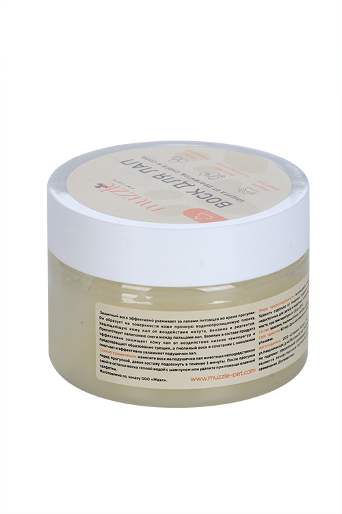 Восковый состав Muzzle для лап собак и кошек разработан с целью защиты и ухода за лапами домашних животных в различных погодных условиях. Комбинация ингредиентов, таких как вазелин, пчелиный воск и ланолин, создает мощный барьер, который предотвращает пересыхание кожи и образование трещин, особенно актуальных в зимний период или при пеших прогулках на каменистых и горячих поверхностях.