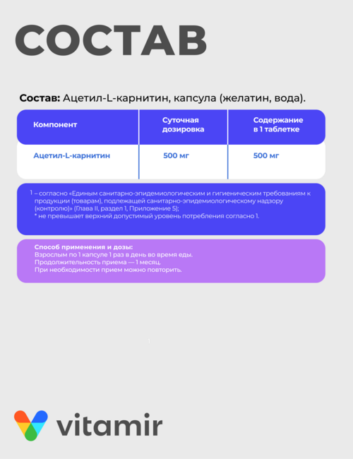 Ацетил-Л-Карнитин Витамир капс 500 мг x30 Квадрат-С