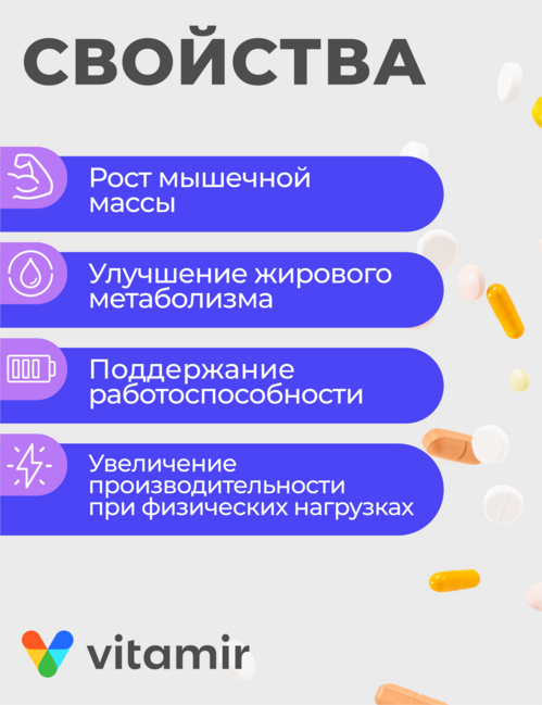 Л-Карнитин помогает также усилить рост мышечной ткани за счет улучшения усвояемости пищи, в частности белка, и скорректировать массу тела посредством оптимизации жирового метаболизма.