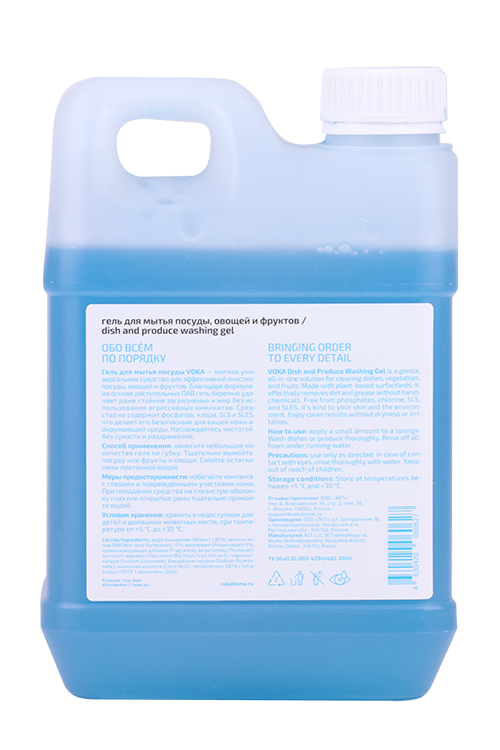 Гель VOKA экономичен в использовании. Его концентрированный состав и объем 2000 мл обеспечивают длительное применение, что особенно выгодно для больших семей. Возможность эффективно работать в холодной воде добавляет средству практичности, позволяя экономить энергию на подогрев. Эта особенность также делает его удобным для использования, например, на даче или в условиях, где доступ к горячей воде ограничен.